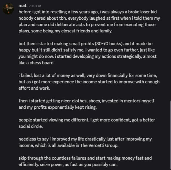 You can’t afford to listen to scammers and dumbass influencers anymore.In The Vercetti Group, we teach you exactly how to build a cash flow machine with just 0-100€ starting capital.
